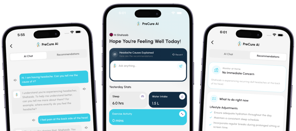 PreCure AI is an AI-powered health assistant that helps you understand symptoms, receive personalized health recommendations, and track daily health habits like sleep, exercise, medicine, and water intake.